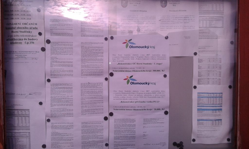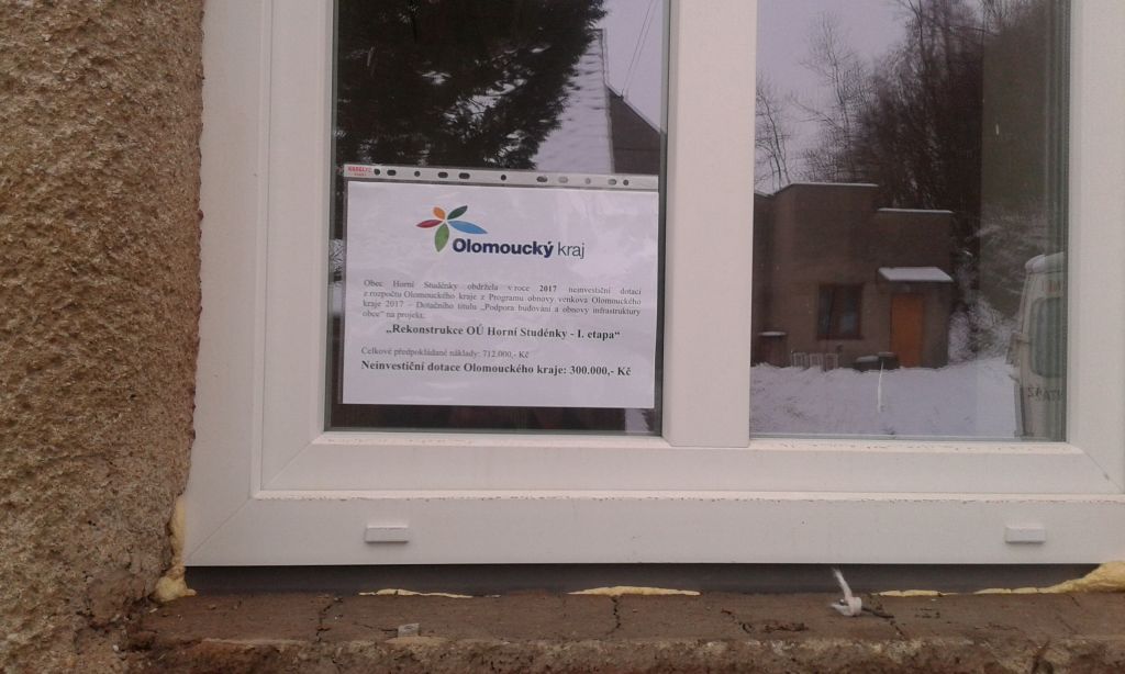 Obec Horní Studénky obdržela v roce 2017 neinvestiční dotaci z rozpočtu Olomouckého kraje z Programu obnovy venkova Olomouckého kraje 2017 – Dotačního titulu Podpora budování a obnovy infrastruktury obce na projekt: